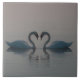 Phantastisches Foto von zwei Schwänen, die von Kopf zu Kopf schwimmen und so die Illusion eines Herzens auf dem Wasser erzeugen. Sie sind zusammen auf einem frühen morgendlichen Stausee.