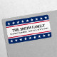 Patriotische Rücksendeadressen-Aufkleber mit weißen Sternen auf blauem Hintergrund als Rand oben und unten. Anpassbare Vorlagenfelder für Ihren Namen und Ihre Adresse.
