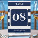 Wasserblau und weiß gestreifte Hochzeitskarte. Die Tischnummer ist gestrichen. Ideal für eine Hochzeit der Marine (Militär) oder des Seehauses. Personalisieren Sie es mit Ihren Hochzeitsdetails und ändern Sie die Zahl für jeden Tisch.