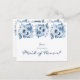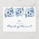 vorne: Ein klassisch schicker weißer Hintergrund. Die Blumen sind mit Blume in Aquarelltönen geschmückt. Vorlage für den Namen der Trauzeugin. Text: Werden Sie meine Trauzeugin sein? Der Text: Trauzeugin ist mit großen, modernen handgeschriebenen Schriftzeichen, blauen Buchstaben geschrieben. Zurück: Blaue Blumen und Vorlagen für Ihren Text und Namen.