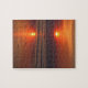 Stellen Sie Ihr Rätsel-Können auf die Probe mit diesem Bild eines strahlenden orangen Sonnenuntergangs, der im Wasser eines romantischen Abends reflektiert wird. 8 x 10 Zoll Puzzle mit 110 Stücken.