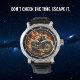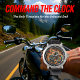 This close-up image showcases a bold watch face with a dynamic illustration of a custom motorcycle. The bike is enveloped in vibrant orange and red flames, creating a sense of speed and intensity against a dark background. Silver numbers and watch hands are clearly visible, making it a striking accessory for motorcycle enthusiasts who appreciate high-energy designs.