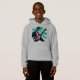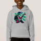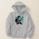 Ein robotisches Skelett mit einem blauen Punk-Mohawk spielt eine leuchtend rosa E-Gitarre, die beim Spielen elektrische Energiewellen abgibt. Der Roboter trägt eine schwarze Lederjacke.