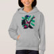 Ein robotisches Skelett mit einem blauen Punk-Mohawk spielt eine leuchtend rosa E-Gitarre, die beim Spielen elektrische Energiewellen abgibt. Der Roboter trägt eine schwarze Lederjacke.