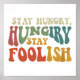 "Bleibe Hungry, Bleibe Foolish" in einer fett-farbigen Darstellung. Jedes Wort bricht mit einer anderen lebhaften Farbe auf und schafft einen spielerischen und dynamischen Look. Der Text selbst ist auf der Vorderseite des Wandbrettes mit einem sauberen und puristischen Hintergrund sichtbar, um die Nachricht hervorstechen zu lassen.