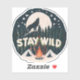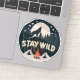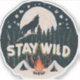 Ein Wolf steht zum Schweigen und heult gegen einen Vollmond, umgeben von einem Wald und einem Lagerfeuer zwischen zwei Zelten. Die Worte "Bleibe Wild" werden prominent angezeigt und unterstreichen ein Gefühl von Abenteuer und Natur.