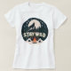 Ein Wolf steht zum Schweigen und heult gegen einen Vollmond, umgeben von einem Wald und einem Lagerfeuer zwischen zwei Zelten. Die Worte "Bleibe Wild" werden prominent angezeigt und unterstreichen ein Gefühl von Abenteuer und Natur.