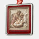 This keepsake ornament portrays a tender nativity tableau: two angels in flowing robes, crowned with grace, gazing upon the Holy Child nestled in straw. White roses bloom at the corners, symbols of purity and eternal devotion. The cracked, vintage texture evokes timeless reverence, as though this piece were carried through generations of prayer. Hung upon the tree, it becomes not only decoration but a blessing—an emblem of peace, guardianship, and divine love.