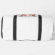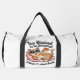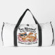 This white duffle bag features a cute cartoon cat wearing sunglasses and lounging on a pillow, holding a slice of pizza, with the text "Too Blessed to be Stressed" and "Unless it's about Food!" below. This humorous and relatable design is perfect for cat lovers who also enjoy their snacks. Edit color of the bag caps and body in the Design tool to your favored colors.