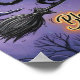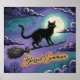This whimsical poster features a black cat with glowing green eyes riding a broomstick under a full moon, framed by dark clouds and flying bats, symbolizing mystery and Samhain's magic. Finished as an oil paint art print.