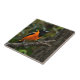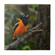 Eine Oriole steht auf einem Zweig und schaut nach oben.