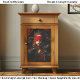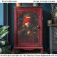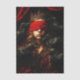 Ein dramatisches, dunkles Fantasy- und Gothic-Romance-Porträt mit einer mysteriösen, gekrönten Frau, die eine reiche, karmesinrote Augenbinde trägt, während sie von wachsamen schwarzen Raben umgeben ist. Die Figur steht vor tiefen Schatten und dunklen Samtvorhängen, wodurch eine stimmungsvolle und theatralische Atmosphäre entsteht. Ihre aufwendige, antike Krone leuchtet sanft gegen ihr fließendes, kastanienbraunes Haar, während die lebhafte rote Augenbinde einen auffallenden Fokuspunkt einführt, der schön mit den dunklen Federn der um sie herum versammelten Raben kontrastiert. Die Vögel erscheinen schützend, neugierig und symbolisch, wodurch das Gefühl von Mysterium und Folklore verstärkt wird. Die Komposition evoziert Themen wie Prophezeiung, Intuition, verborg