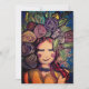 Die skurrile Darstellung zeigt eine lächelnde Person, die mit einer lebhaften Krone von Blume und Blätter geschmückt ist. Der Hintergrund ist mit wirbelnden Motiven versehen, die das lebhafte und fröhliche Ambiente noch verstärken