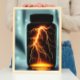 Ein cooles, digitales Kunstposter mit einem dramatischen, leuchtenden Blitzschlag in einem geschlossenen Glas.