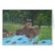 Pastellmalerei eines Blockhauses nahe bei einem Strom. Die Kabine wird durch Bäume mit Bergen im Hintergrund umgeben.