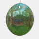 Acrylmalerei eines Blockhauses umgeben durch Berge und Bäume.