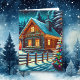 Personalisierte Weihnachtskarte. Eine schöne, beleuchtete Blockhütte am Heiligen Abend mit Weihnachtsbeleuchtung und schneebedeckten Bäumen. Da der Schnee auf diese magische Nacht fällt, wünsche ich Ihnen alles Gute und viel Schärfe. Eine personalisierte Urlaubskarte, die Ihnen ein gemütliches und gemütliches Ambiente verleiht.