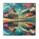 Schöne, farbenfrohe Wellen und eine Holzhütte mit Blick auf den Ozean in einer sternenreichen Nacht.
