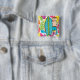 Ein blonder, blonder Surfer Junge mit blauem Surfbrett, umgeben von tropischen Pflanze in verschiedenen leuchtenden Farben auf einem Knopf, der unseren Blond Surfer Boy Einladungen, Porto-Briefmarke und Aufkleber passt!