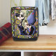 Blonde Fee mit lila und roter Farbe in einem geometrischen Blumenmuster aus Grün, Ornament, Lavendel und Rosa,