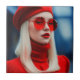 Blonde Lady in Rot-Jumpsuit-Beret und rote Sonnenbrille