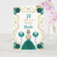 Die Einladung zur Geburtstagskarte beinhaltet einen eleganten Goldrahmen, eine hübsche Prinzessin mit blondem Haar und ein aquamarines blaues Kleid, Blume und einen Ballon.