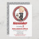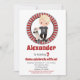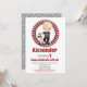 Die Einladung dieses Jungen zum Geburtstag enthält einen niedlichen blonden Jungen mit seinem Skateboard. Auf coolem grauem und rotem Hintergrund.