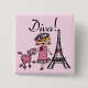 Diva-T - Shirts, Bodysuits, Tassen, Taschen, Karten, Aufkleber, Schlüsselketten, Kissen, Wanduhren und viel mehr mit einem niedlichen Divaentwurf, der ein blondes behaartes Mädchen in einem Hut und in einem rosa Kleid mit ihrem rosa Pudel nahe dem Eiffel-Turm kennzeichnet!