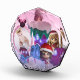 con tres muñecas y casa de enanos con nieve y luces y marco co piedras de cristal con la foto.