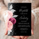 Die links Seite dieses eleganten, modernen Hochzeitseinladens besticht durch ein Blumenstrauß in Bordeaux- und Rosatönen, das mit Silberfolie aus Imitat und Imitaten Glitzer bedruckt und mit silberfarbenem Imitat-Glitzer bestreut ist. Der anpassbare Text kombiniert silbergraue Handschrift, Copperplate und kursiv Schriftart auf schwarzem Hintergrund. Die Rückseite weist ein passendes Blumendesign auf.