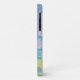 Dieses Handy-Gehäuse stellt eine digitale Collage aus mehreren Ebenen von Scans von Fotografien, Gemälden und Texturen vor. Eine Reihe blauer violetter Blume mit abstraktem Hintergrund in Lavendeltönen, Grün, lila und Blautönen.