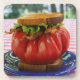 Wir züchteten diese riesige Erbtomate und mussten einfach ein humorvolles Foto nehmen, indem wir es in einem Sandwich benutzten. Dieses Foto macht ein perfektes Plakat oder Druck für Küchenkunst, oder sieht sogar phantastisch auf Ihrem iPad Gehäuse!