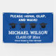 Fügen Sie zu den Abschluss-Festlichkeiten eines Absolventen während der Coronavirus-Zeiten mit diesem bitte honk und Welle Gratulationen blauen Banner! Wenn du keine Abschlussfeier haben kannst, dann lass eine Autoparade! Personalisieren Sie die Angaben mit dem Namen des Absolventen, dem Abschluss, dem Schulnamen oder anderen benutzerdefinierten Nachrichten.