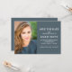 Moderner Abschluss Save the Date eine Flachkarte für Absolventen der Klasse 2022 (oder jedes Jahr), die mit Ihrem Foto, Namen, Schulname, Abschluss, Datum des Abschlusses und Ort personalisiert ist, sowie eine Nachricht, dass die formelle Einladung später verschickt wird. Die individuell anpassbare Hintergrundfarbe ist ein elegantes Schieferblau.