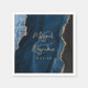 Diese eleganten modernen Hochzeitsnapkins sind mit einem marineblauen Aquarell mit Geodenhintergrund versehen, der mit Imitaten mit goldenem Glitzer bestickt ist. Personalisieren Sie sie mit den Namen des Ehepaares in goldfarbener Handschrift Kalligraphie über einen großen blauen Ampersand, und das Hochzeitdatum in Kupferplatte Schriftart.