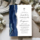 Die links Seite dieses eleganten, modernen First-Communion-Einladens besticht durch eine marineblau-blaue Aquarellgrenze, die mit Imitaten aus silberem Glitzer bestickt ist. Über dem anpassbaren Text erscheint ein Imitat silbernes Folienkreuz, das Handschrift, Copperplate und kursiv Schriftart in Holzkohlegrau auf weißem Hintergrund kombiniert. Auf der Rückseite ist ein passendes marineblau-silberfarbenes Design erkennbar.