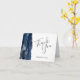 Diese elegante, moderne Hochzeitskarte mit einem blauen Aquarellstreifen bestickt mit Imitaten silbernen Glitzer. Der anpassbare Text kombiniert die Worte "Danke" in der handgeschriebenen Handschrift aus Holzkohle und die Namen der Braut und des Bräutigams in kursivem Schriftart auf weißem Hintergrund.