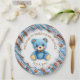 Blue and brown yarn crocheted teddy bear. it's a boy baby shower paper plates. Adorable trendy theme for a sweet boy's baby shower.