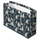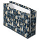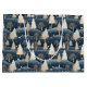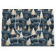 A lush winter pattern featuring deep blue fields topped with falling snow, cream deer silhouettes, and hearty cream winter pine trees dotting the landscape.