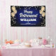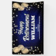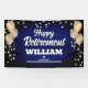 Fun banner sign for indoors or out, featuring festive gold metallic balloons on both sides of the design with sparkly, gold metallic confetti on a rich textured blue background for your personalized retirement party banner.