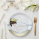 Babyblau und goldfarbener Prinz-Babyduschpapier-Teller mit blau-weißem Perlenhintergrund. Sie können Ihren Text in der gewünschten Schriftart- und Farbgebung anpassen. Einige Grafiken©Delightful-Doodles.