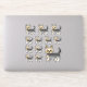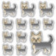 Desteis originelle Cartoon-Illustration einer niedlichen Blau- und Goldfarbe Yorkshire Terrier / Yorkie Rasse Hund. Das Design wird 12 Mal auf dem Blatt in drei verschiedenen Größen platziert. Es gibt einen größeren Hund, drei mittelgroße Hunde und acht kleine Hunde.