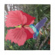 Diese wunderschöne Keramik-Kachel zeigt meinen zeichn eines blauen und grünen Hummingvogels im Mittelflug, der aus einem roten Hibiskus vor einem tropischen Hintergrund füttre.