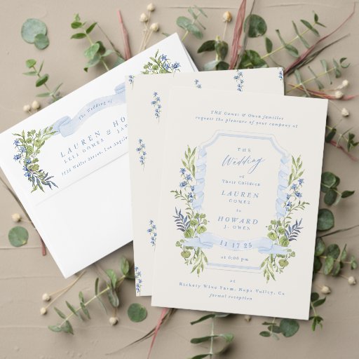blue and greenery garden crest wreath wedding rsvp Invitation