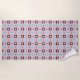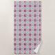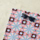 Towel and washcloth set featuring a geometric pattern with blue and pink hues and black accents. Towel hangs on a rod; washcloth is folded, showing a crisp design.