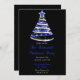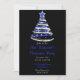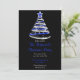 Ein blauer und silberner Weihnachtsbaum auf schwarzem Hintergrund. Die Rückseite der Einladung ist schwarz mit Schneemuster