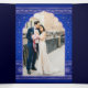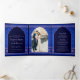 Alles in einer eleganten Hochzeitseinladung mit gemusterter blauer und silberner Karte mit Foto der Braut und des Bräutigams.