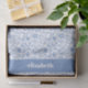 You can be sure your gift will stand out whenever you use this fresh, simple and modern custom name tissue paper. Light dusty French country blue boho block print flower and leaf pattern overlays a white background. In addition, bold modern typography overlays a dusty blue panel. Personalize with the name of your choice. Choose from 4 sizes and 2 weights. Coordinating and matching wrapping paper is also available. Turns a great present into something even better!
