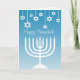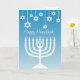 Blue and white stars of David and Happy Hanukkah menorah personalized card.