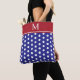 This monogrammed tote bag features preppy navy blue and white polka dots with a top band of classic red. Personalize the monogram with your choice of initial. Great to use as gift bags and party favors.